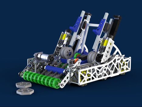 Kunai, named after a traditional Japanese weapon that uses a chain, employs three rows of compliant wheels to quickly intake rings and a flywheel to shoot them across the field. It also features a claw to transport wobble goals, allowing it to accomplish all our game objectives.